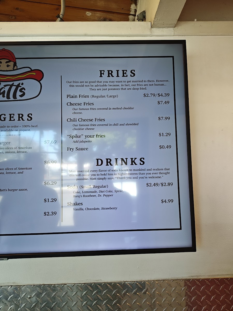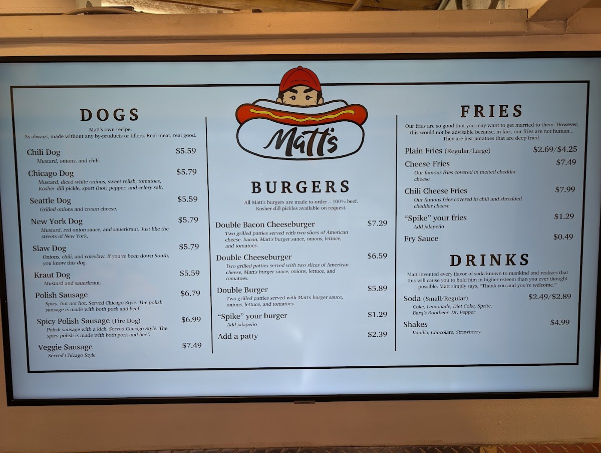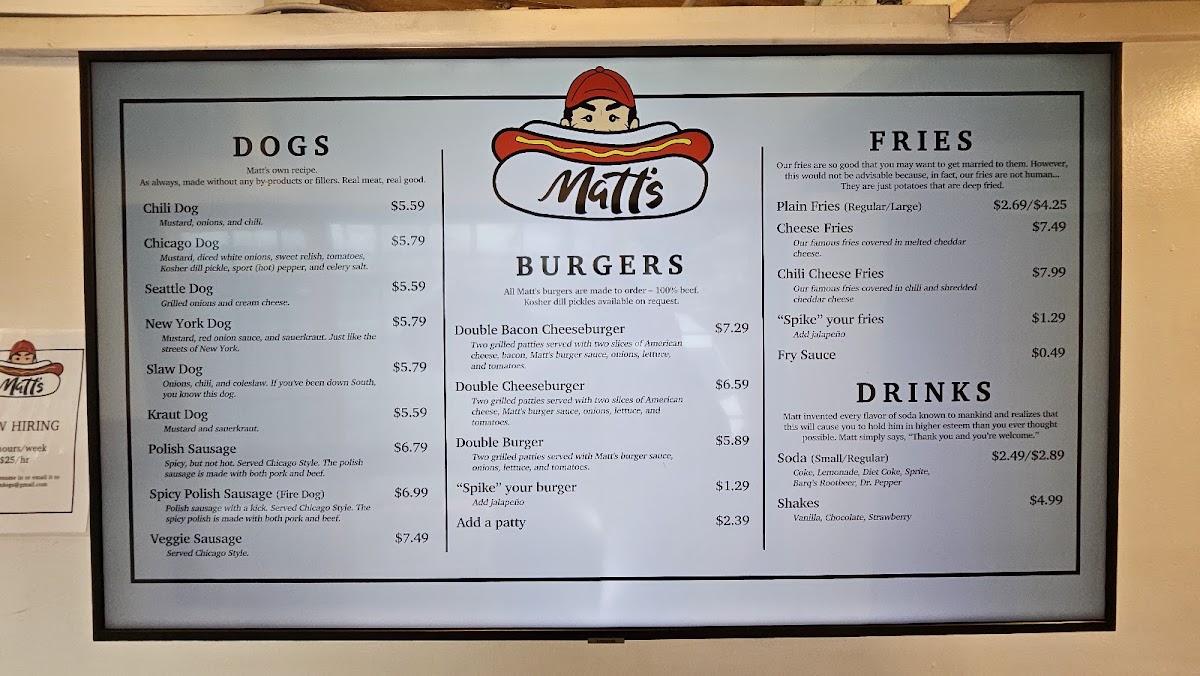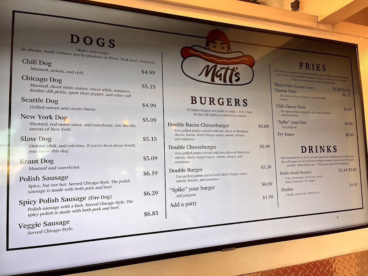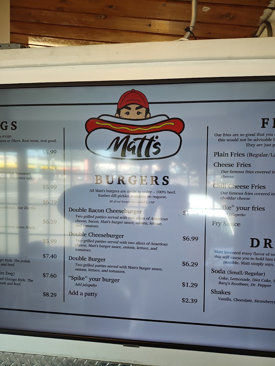 Two grilled patties served with two slices of American cheese, bacon, Matt's burger sauce, onions, lettuce, and tomatoes.